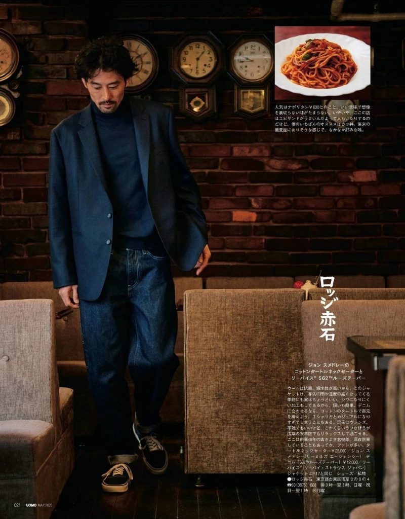 A former basketball player and part-time model, Yamamoto began acting later in life. His masculine presence immediately caught the eye of stylist Akio Hasegawa, who featured him in UOMO’s “A Man’s Essence” column.